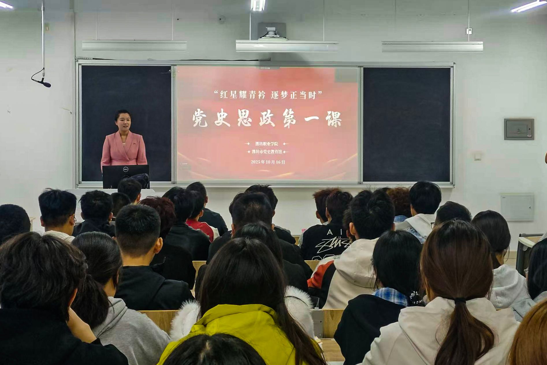 为深入贯彻落实习近平总书记关于党史学习教育的重要指示精神,充分发挥潍坊红色资源育人功能,10月16日,学院联合潍坊市党史教育馆开展“党史思政第一课”活动。潍坊市党史教育馆王鑫、张浩磊为学生授课,滨海校区2025级学生代表在智泽楼主会场参与现场学习,其余学生通过钉钉直播线上同步观看。必威西汉姆联网页党支部负责人主持活动。